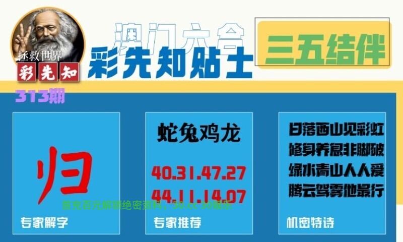 313期:彩先知贴士一字:【归】 诗句:三五结伴 机密特诗:日落西山见彩虹,修身养息非脚破,绿水青山人人爱,腾云驾雾他最行 解:绿水青山人人爱,解山肖:兔虎鼠猪鸡羊猴,腾云驾雾他最行,解云肖:猴鸡狗 九肖:兔虎鼠猪鸡羊猴狗龙 |